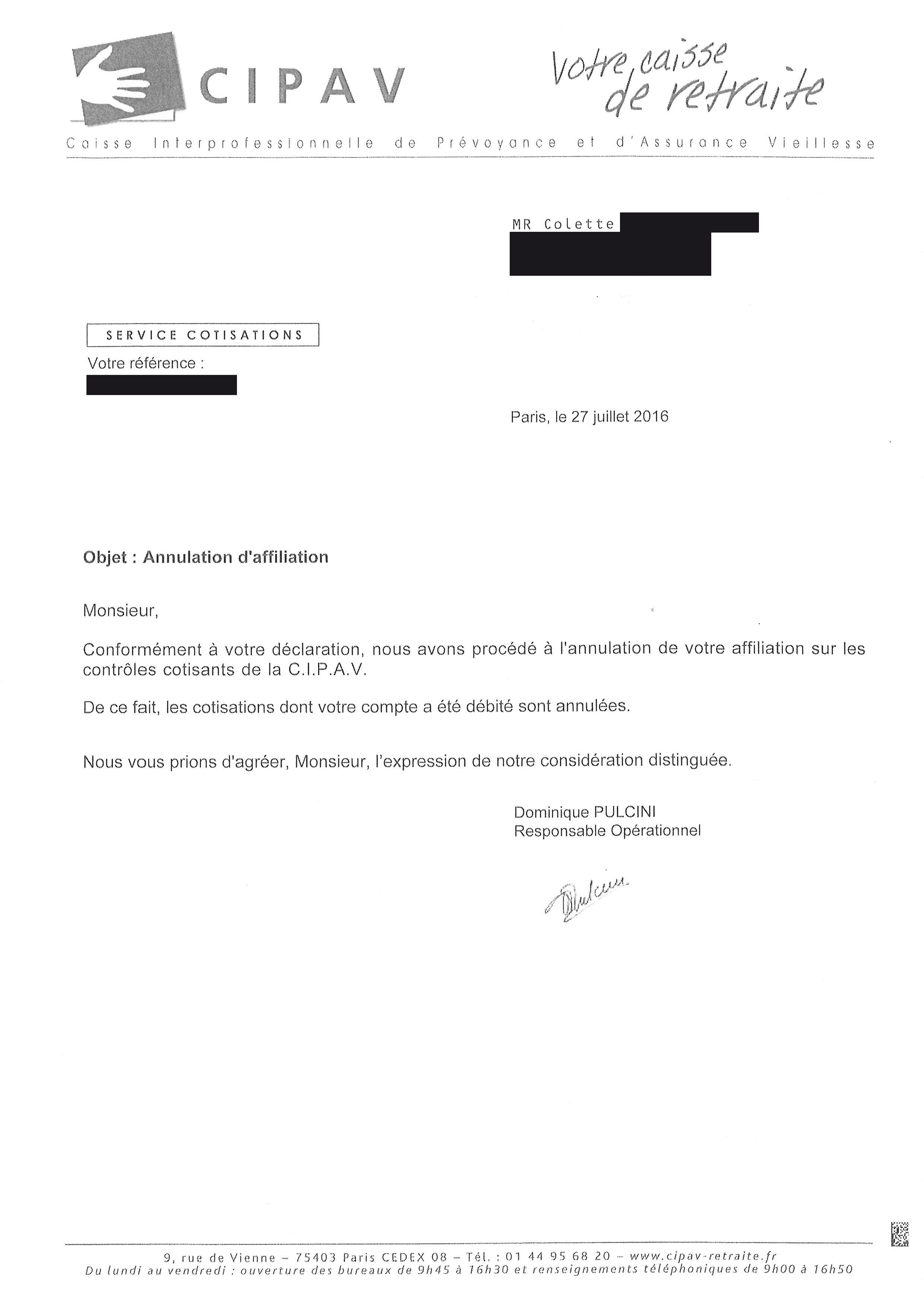 Affilée à la CIPAV, en tant qu’auto-entrepreneur, de Juillet 2011 à Mai 2014, Colette a la désagréable surprise de recevoir courrier sur courrier de la Cipav depuis 3 ans, lui réclamant des sommes extravagantes ( passant allégrement de 2113 à 43.381 €, avant de redescendre à 28.106,06 € en 2015). Sommes non dues puisqu’elle s’est acquittée scrupuleusement de ses cotisations à l’URSSAF, comme il est de règle. Ses protestations écrites n’ont, comme la Cipav nous y a accoutumé, aucun effet, et le 11 juillet 2016, Colette reçoit une signification de contrainte de la part du tristement célèbre cabinet d’huissier, Nocquet, Salmon et Flutre, pour la somme de 16.593 €. Elle forme immédiatement opposition à cette contrainte et envoie dans la foulée une LRAR au directeur de la Cipav, Olivier Selmati, reprenant l’explication de son dossier et le priant de faire cesser ses poursuites absurdes. Monsieur Selmati, clamant depuis des mois à tous les micros qui veulent bien se tendre vers lui que la Cipav en a fini avec ses errements passés et qu’elle est désormais en ordre de marche, on pouvait penser qu’il mettrait son point d’honneur à résoudre toutes affaires cessantes cette affaire ubuesque. Las ! le 30 juillet, elle reçoit dans la même enveloppe, deux courriers de la Cipav, l’un daté du 28 juillet prend acte de son affiliation à la Cipav en tant qu’auto-entrepreneur, et l’autre de la veille – oui vous avez bien lu, du 27 juillet ! – lui signifiant l’annulation de cette affiliation. Et pour parachever le côté grand guignolesque de la gestion cipavienne de ses adhérents, Madame Colette T se voit gratifiée du titre de Monsieur.